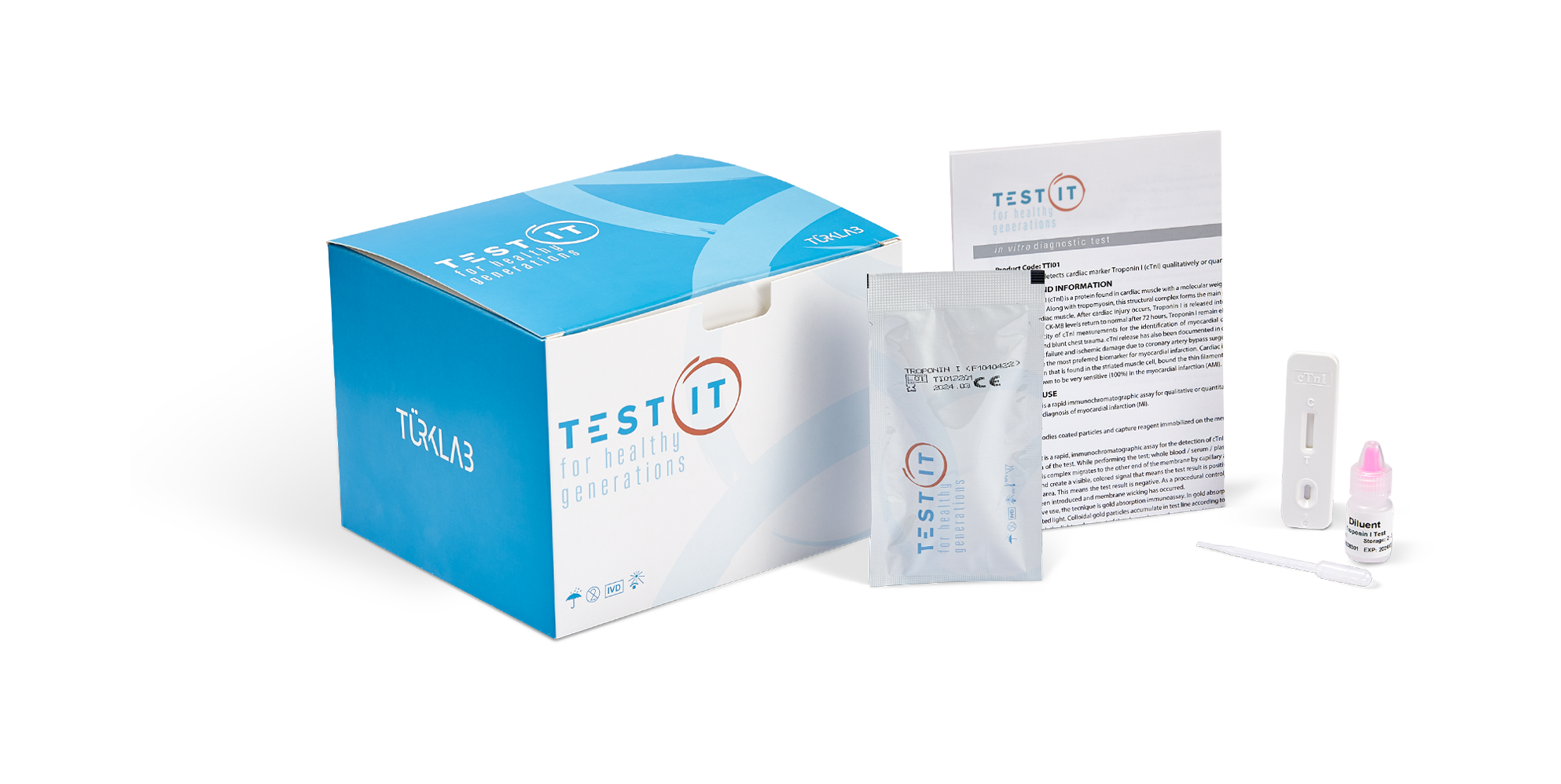 Test-IT Troponin I Test is a immunochromatographic test for the qualitative detection of human cardiac marker Troponin I (cTnl) in human whole blood/serum/plasma to aid diagnosis of myocardial infarction (MI). • Widerange of samples can be used plasma, serum, capillary blood or venous blood. • Verified non-reactivit with skletal Troponin I, Troponin T and cardiac myosin.